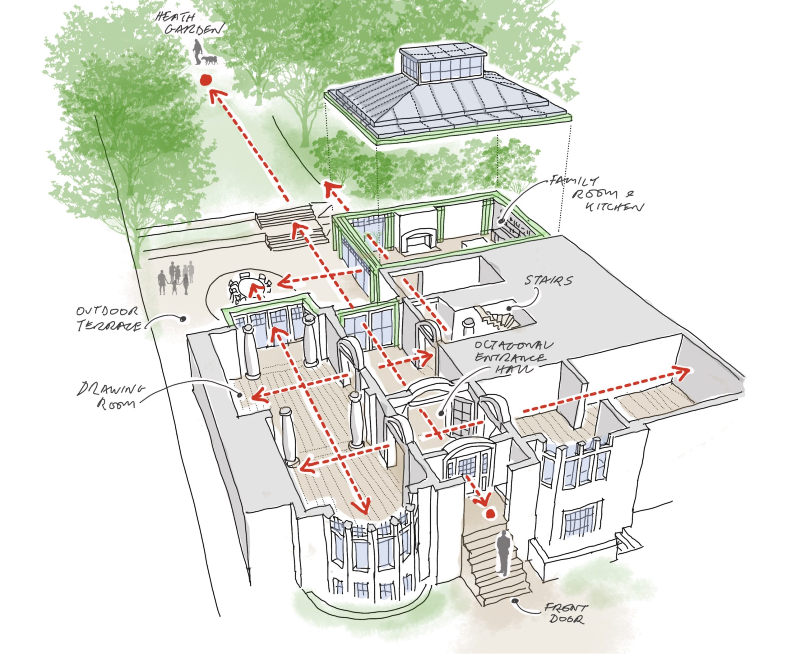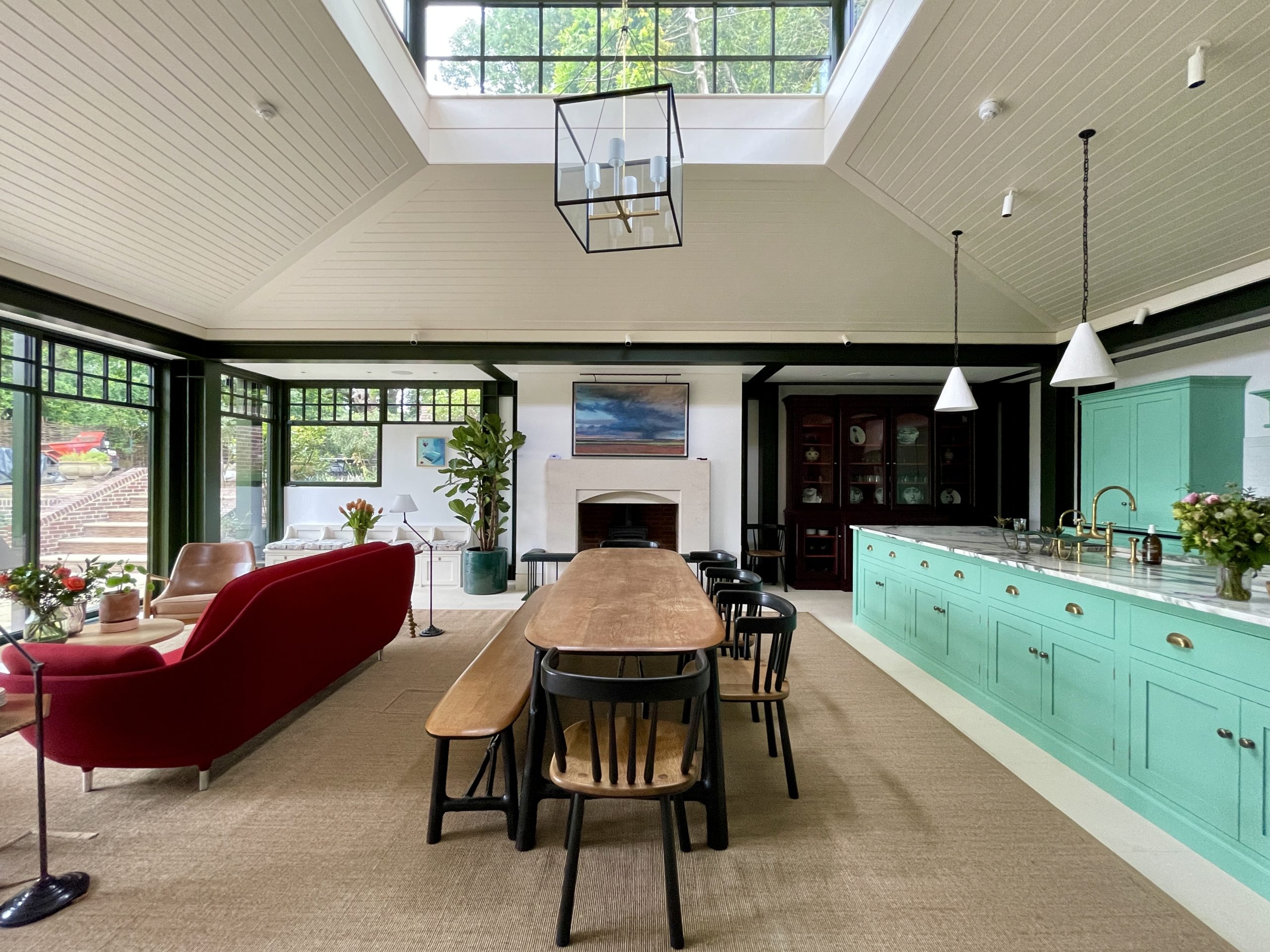 It took a six-year design & construction campaign to convert this 1890’s unlisted Edwardian friary – stripped of all period qualities in the 1950s & very badly altered – back into a commodious family home. Almost everything except the basics of the street elevation is completely new including the axial layout which brings clarity & organisation to this huge house & creates a previously missing focus on the huge heath garden beyond. Also totally invented is the garden Family Room which is intended to have something of the air of a repurposed Edwardian artists studio that might once have stood here.