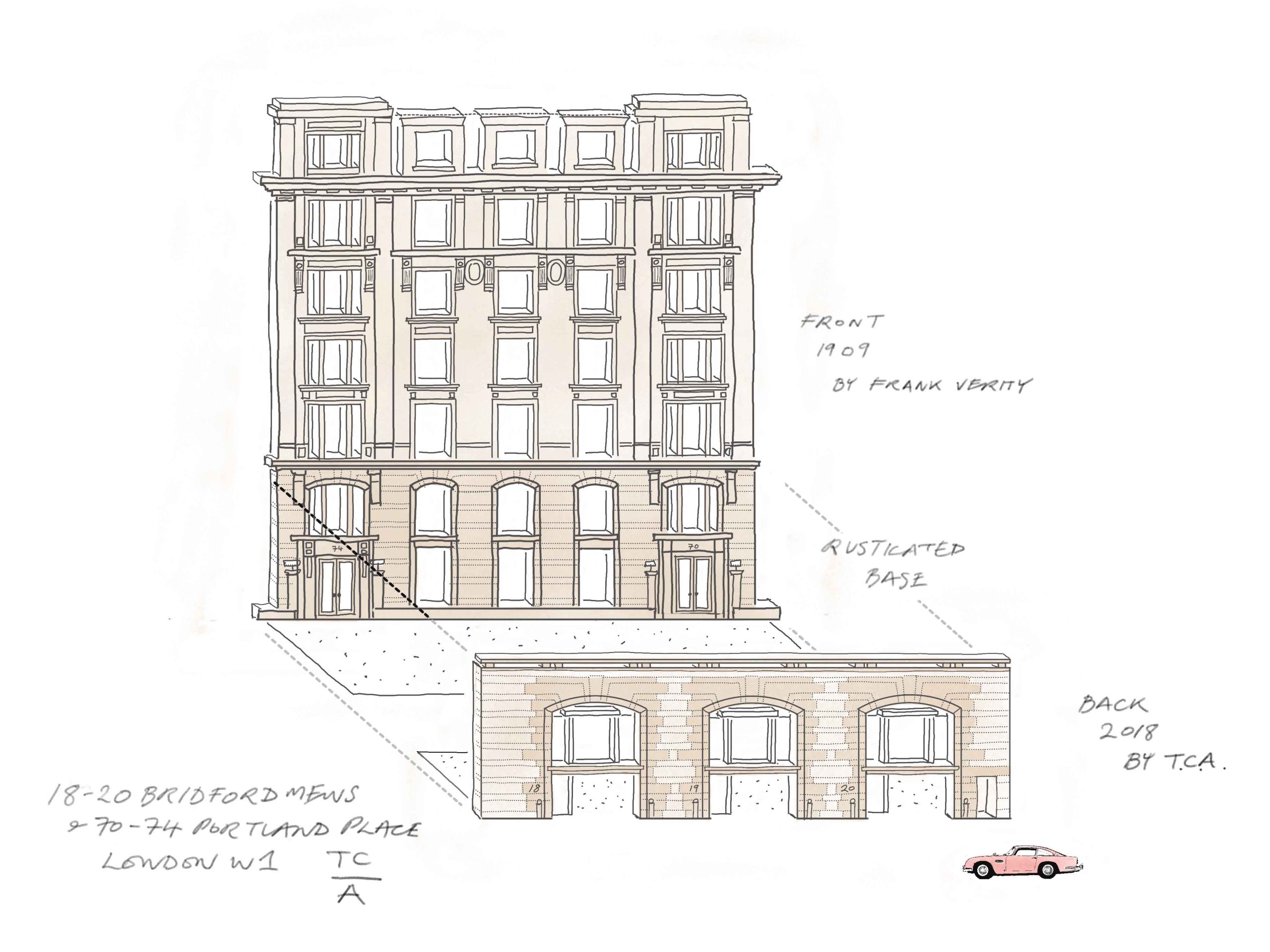 The design narrative is supposed to work on 2 levels. Firstly as way of ‘finishing’ Verity’s building in an elegant way; the old garages were very makeshift. And secondly as a modern version of Nash’s fascadist design method as in the Regent Street / Portland Place development.