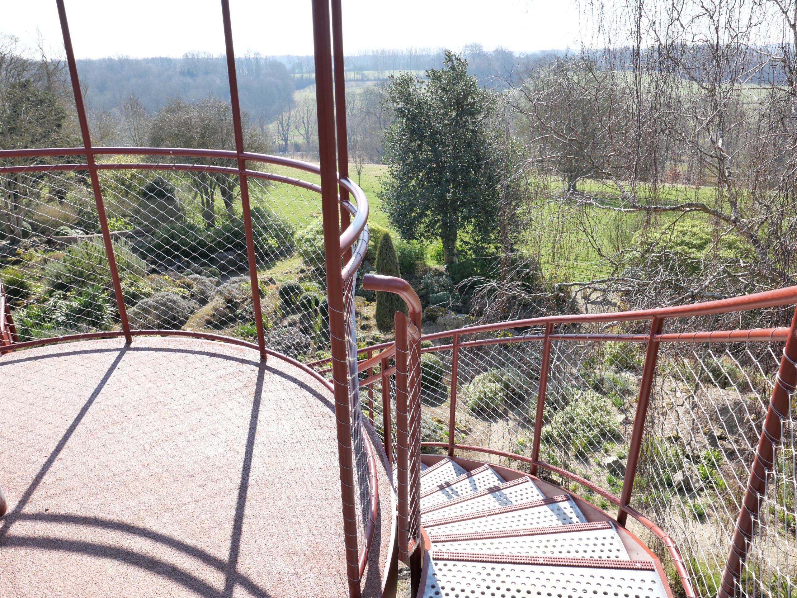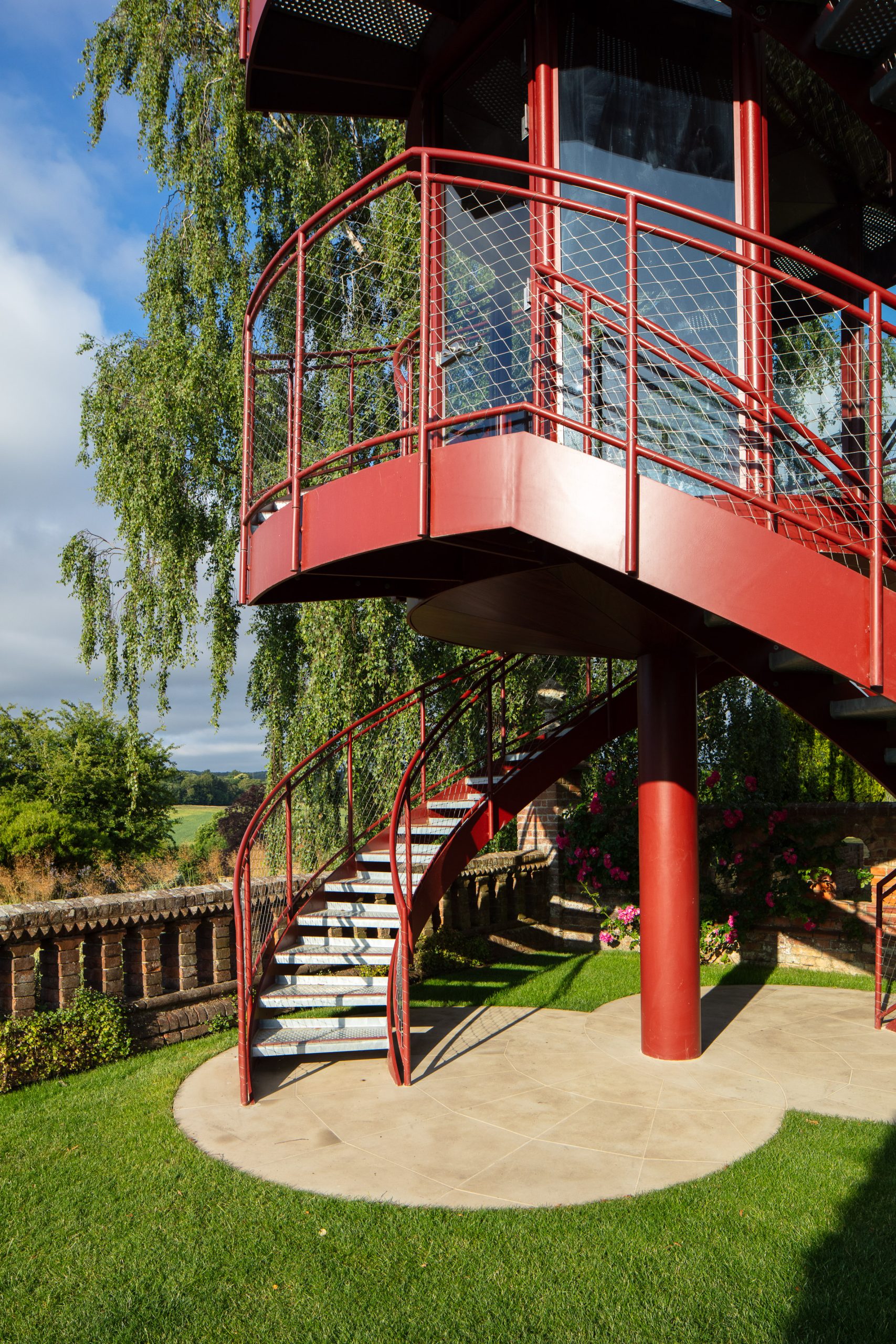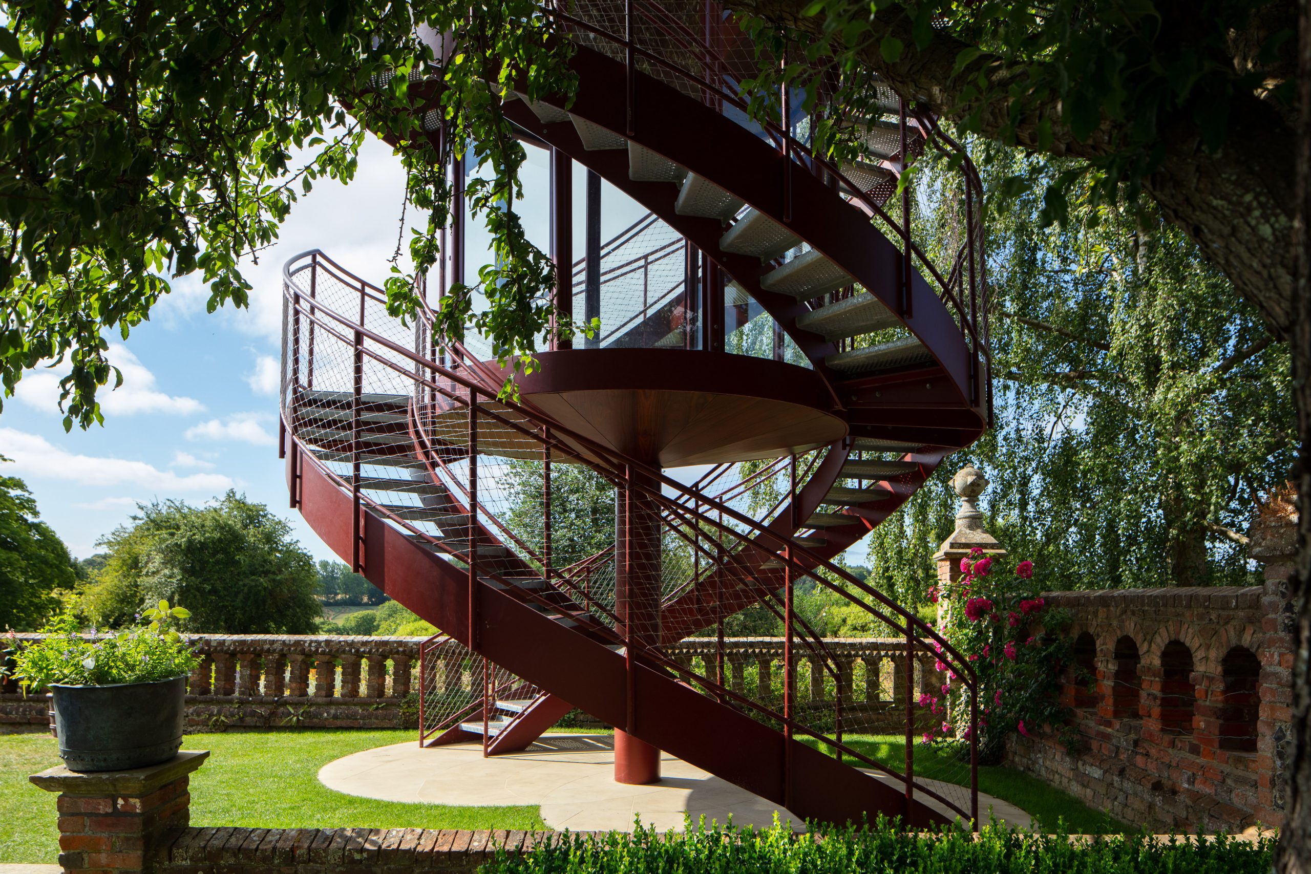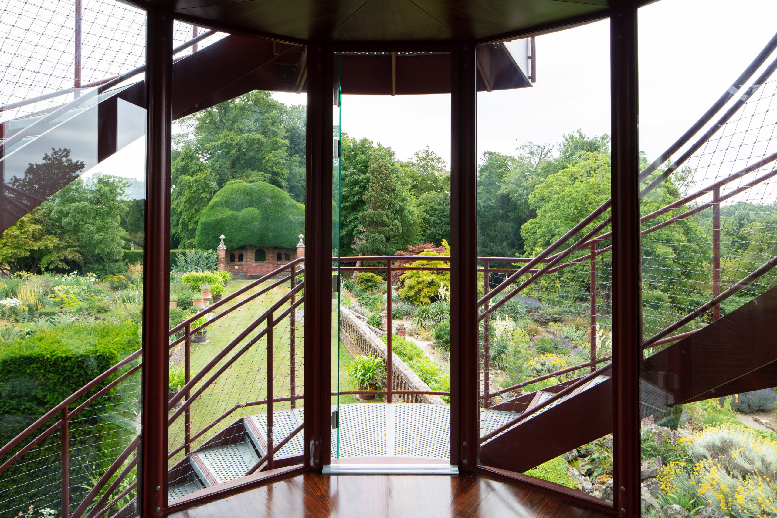 The Tower creates a glazed First Floor summerhouse & a Second Floor public viewing platform enjoying great elevated vistas over the Sunken Garden, the Rock Garden & the valley beyond. The swirling double staircase makes a virtue of the Building Regulation requirement to have separate public upwards & downwards access.