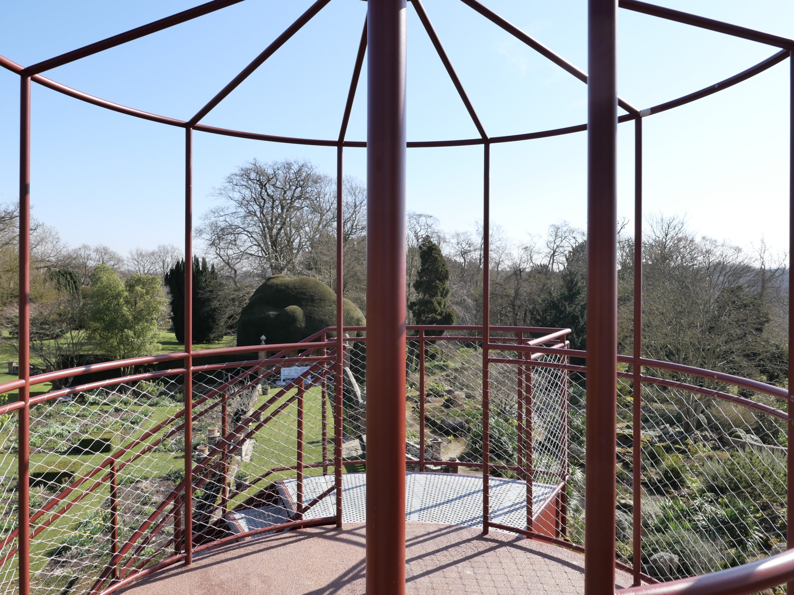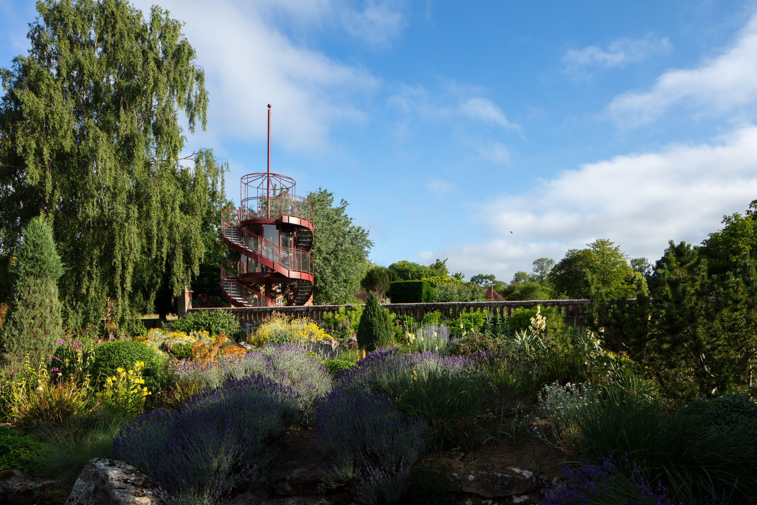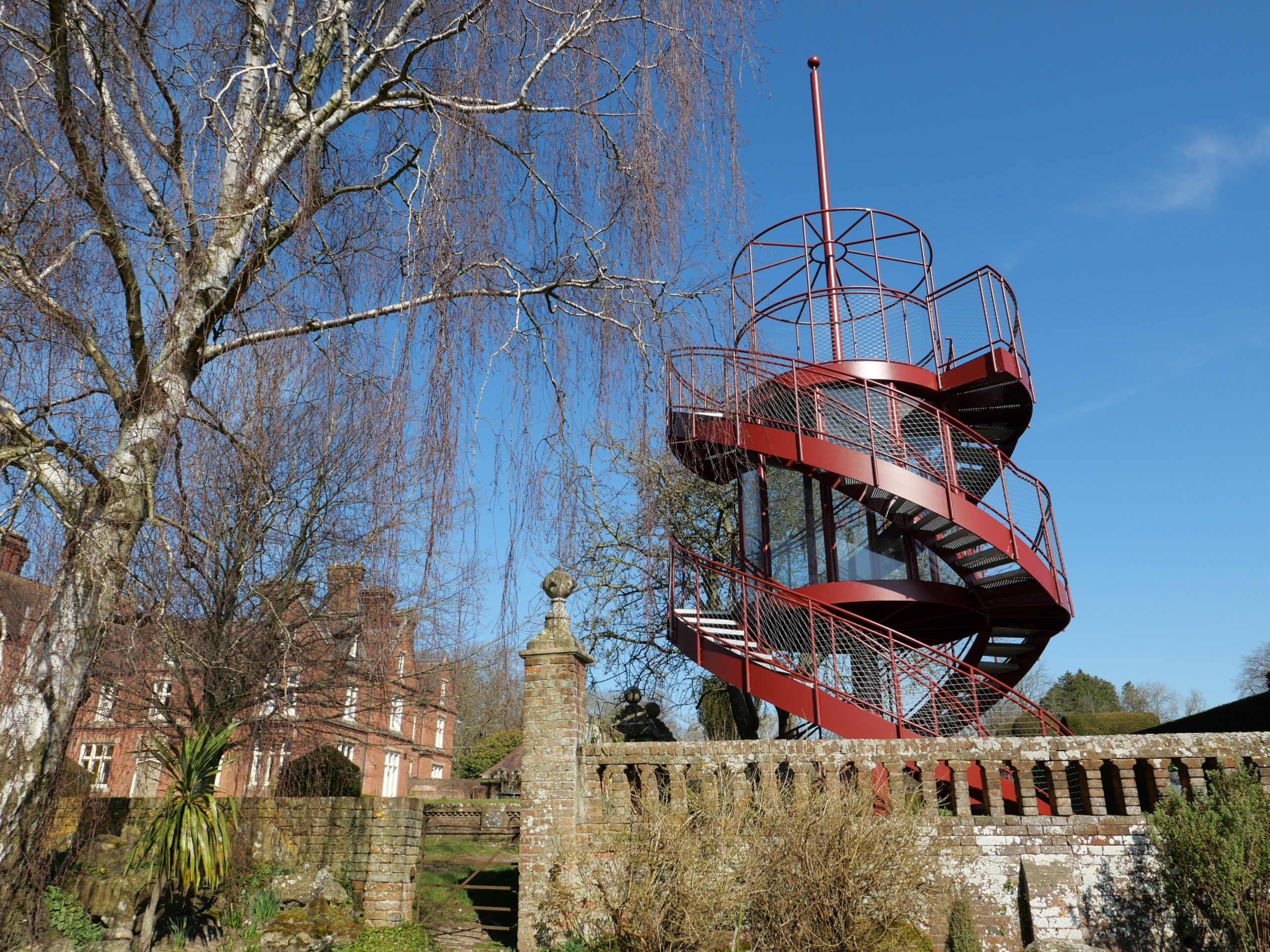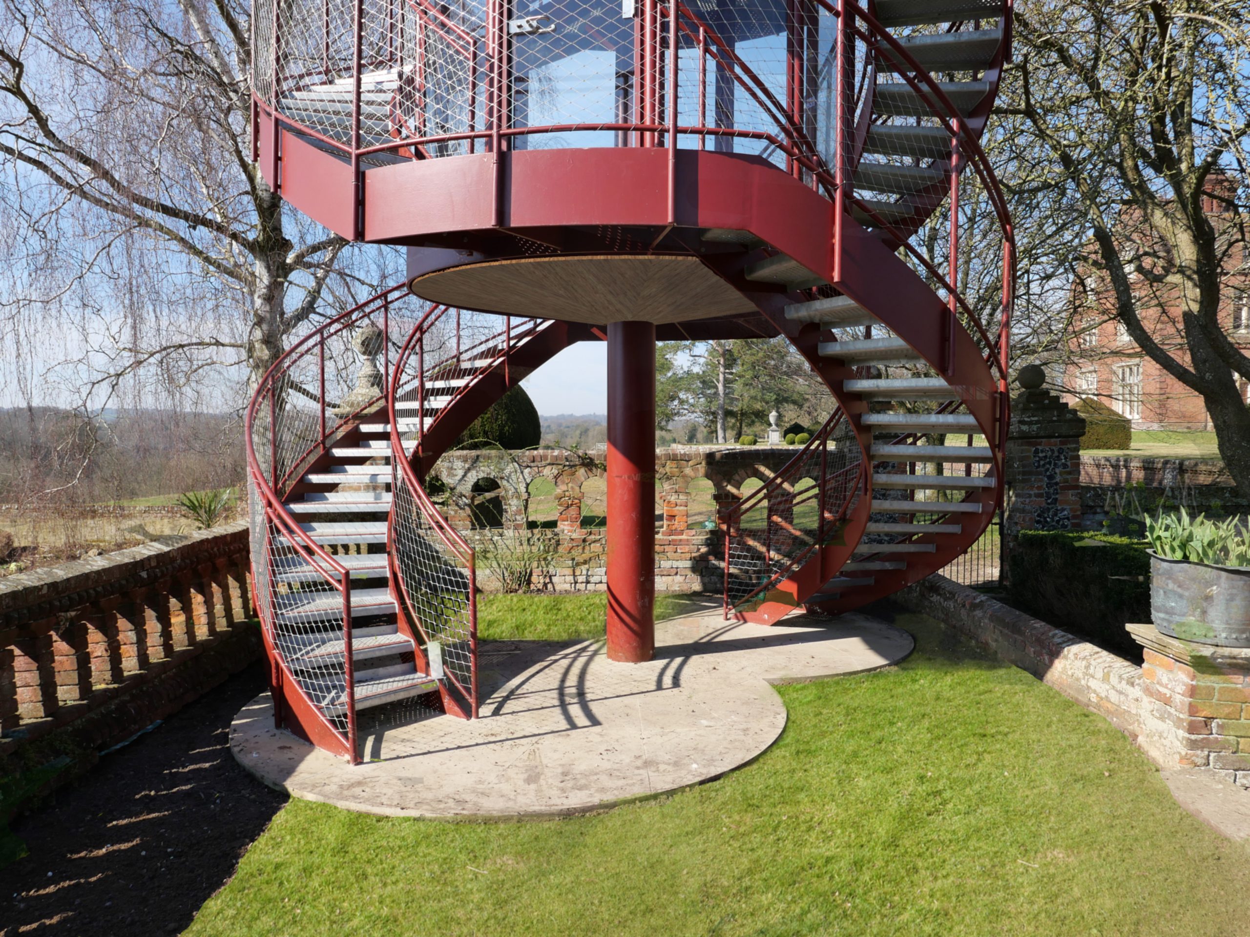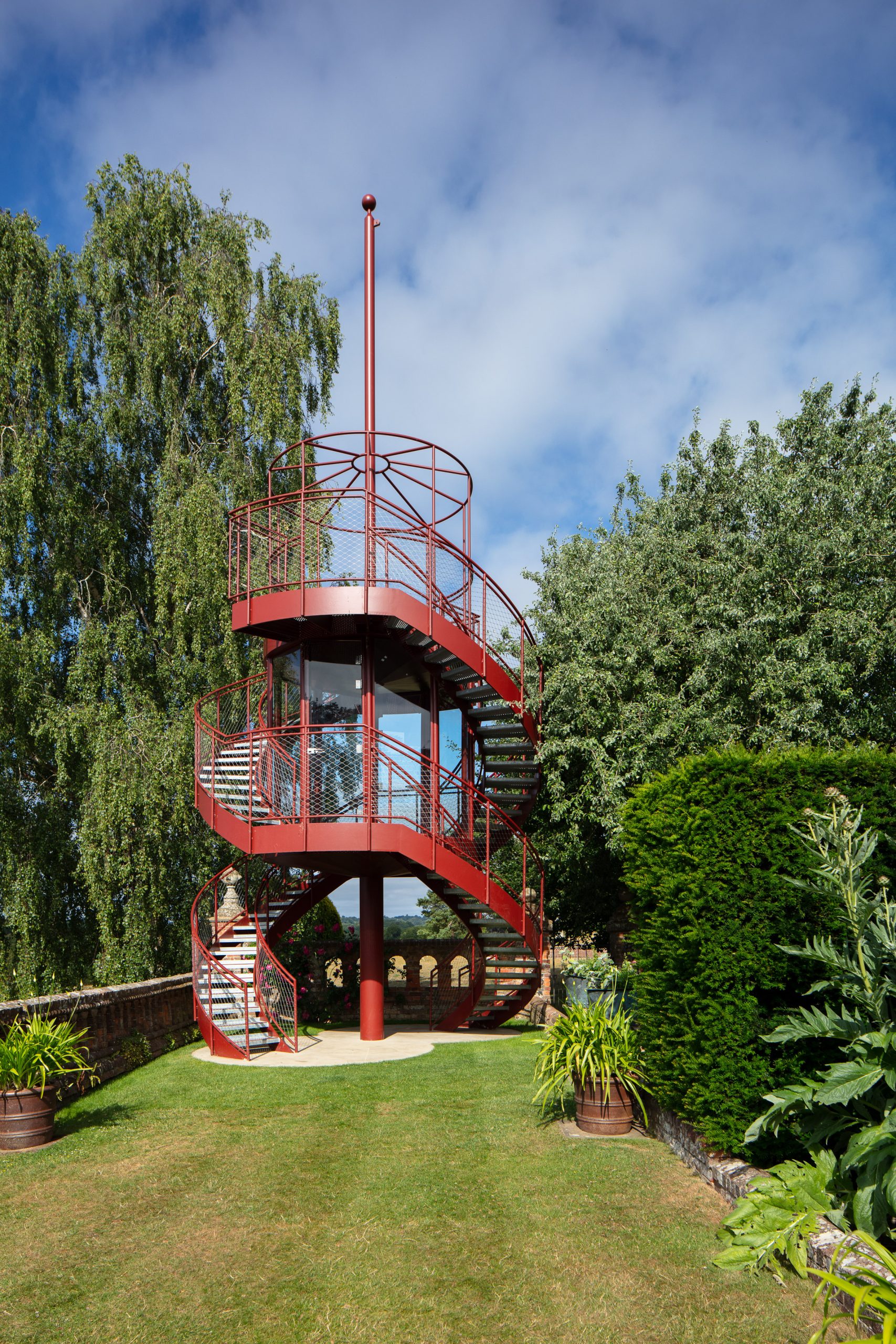 The Tower creates a glazed First Floor summerhouse & a Second Floor public viewing platform enjoying great elevated vistas over the Sunken Garden, the Rock Garden & the valley beyond. The swirling double staircase makes a virtue of the Building Regulation requirement to have separate public upwards & downwards access.