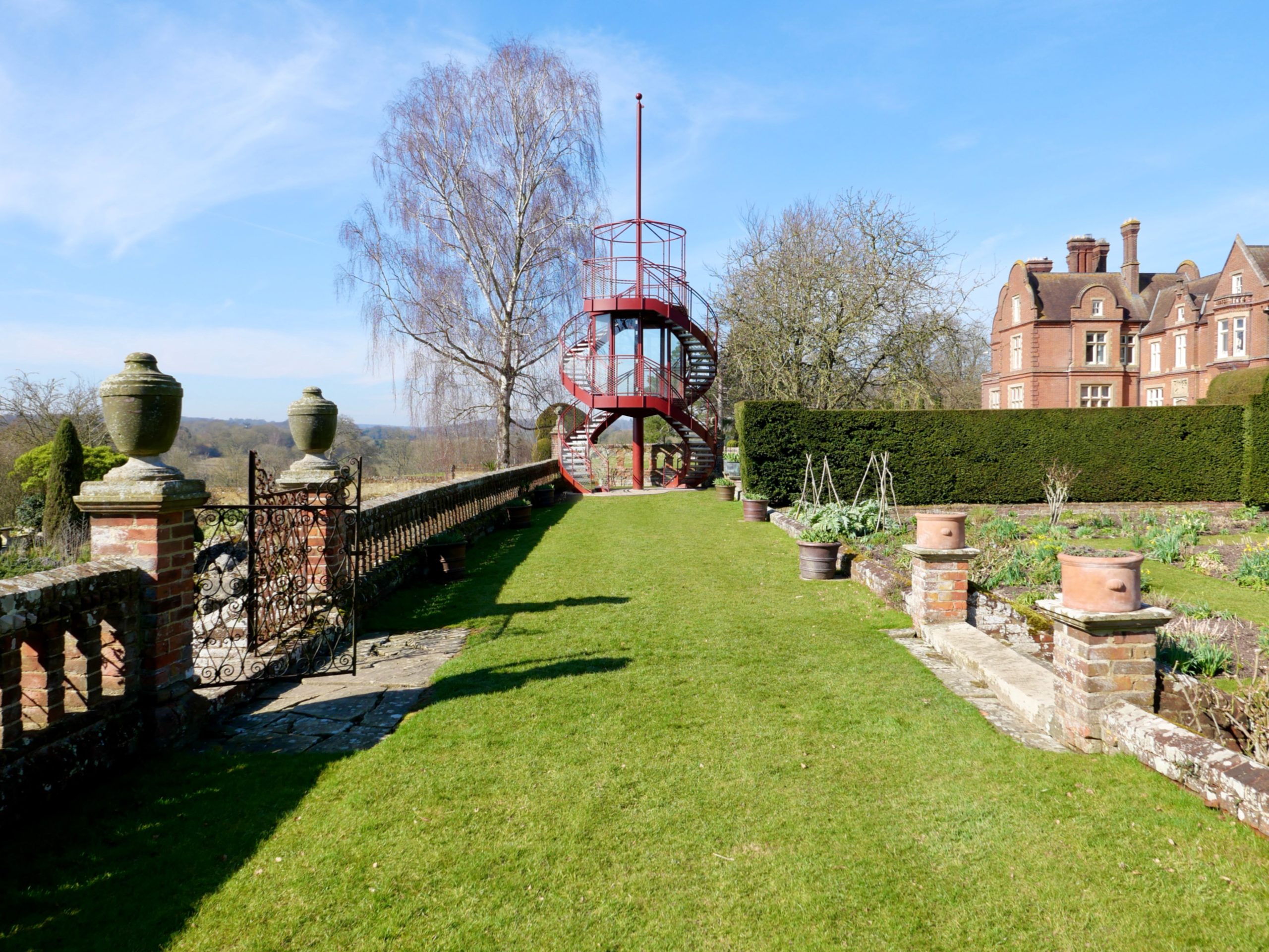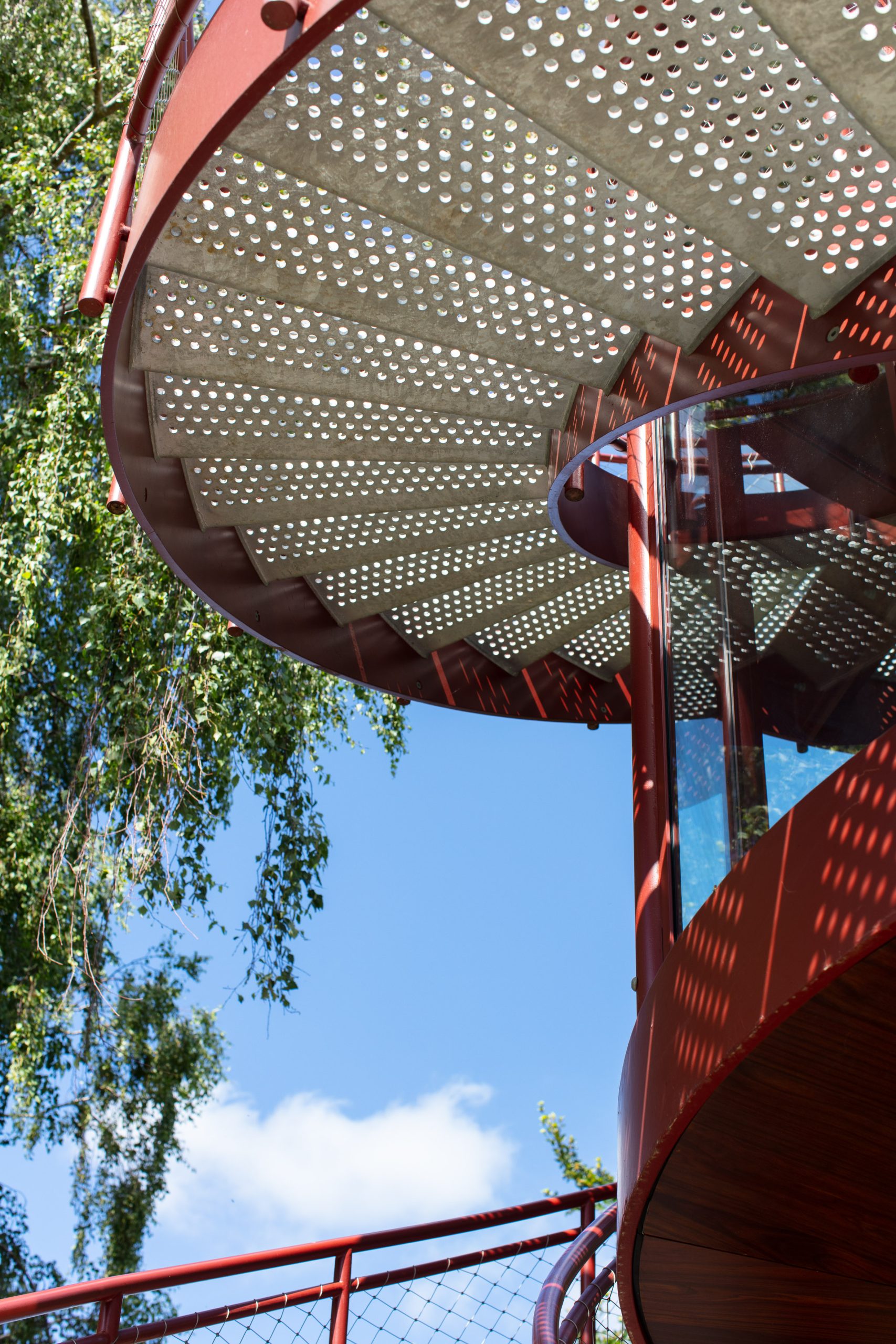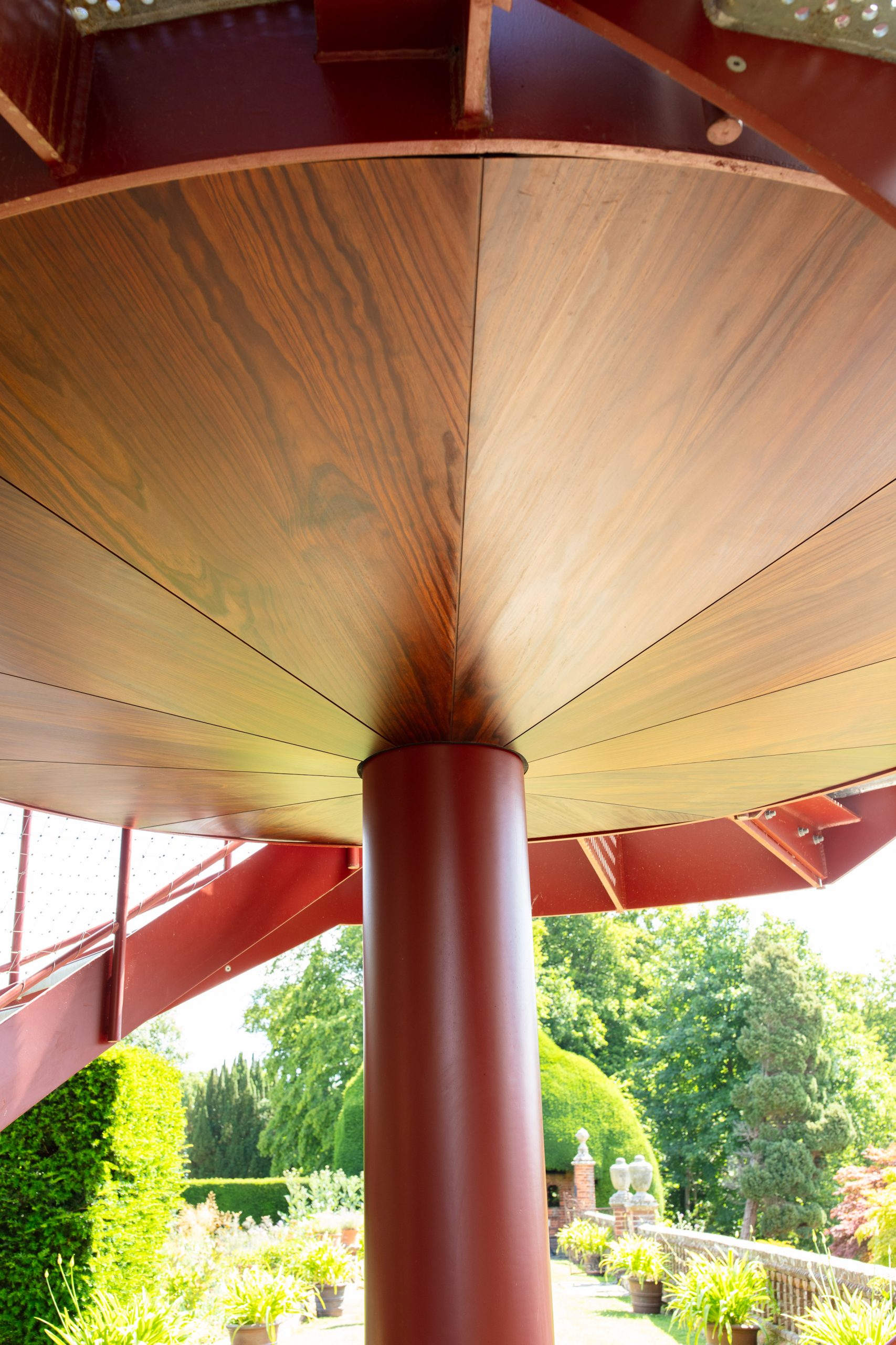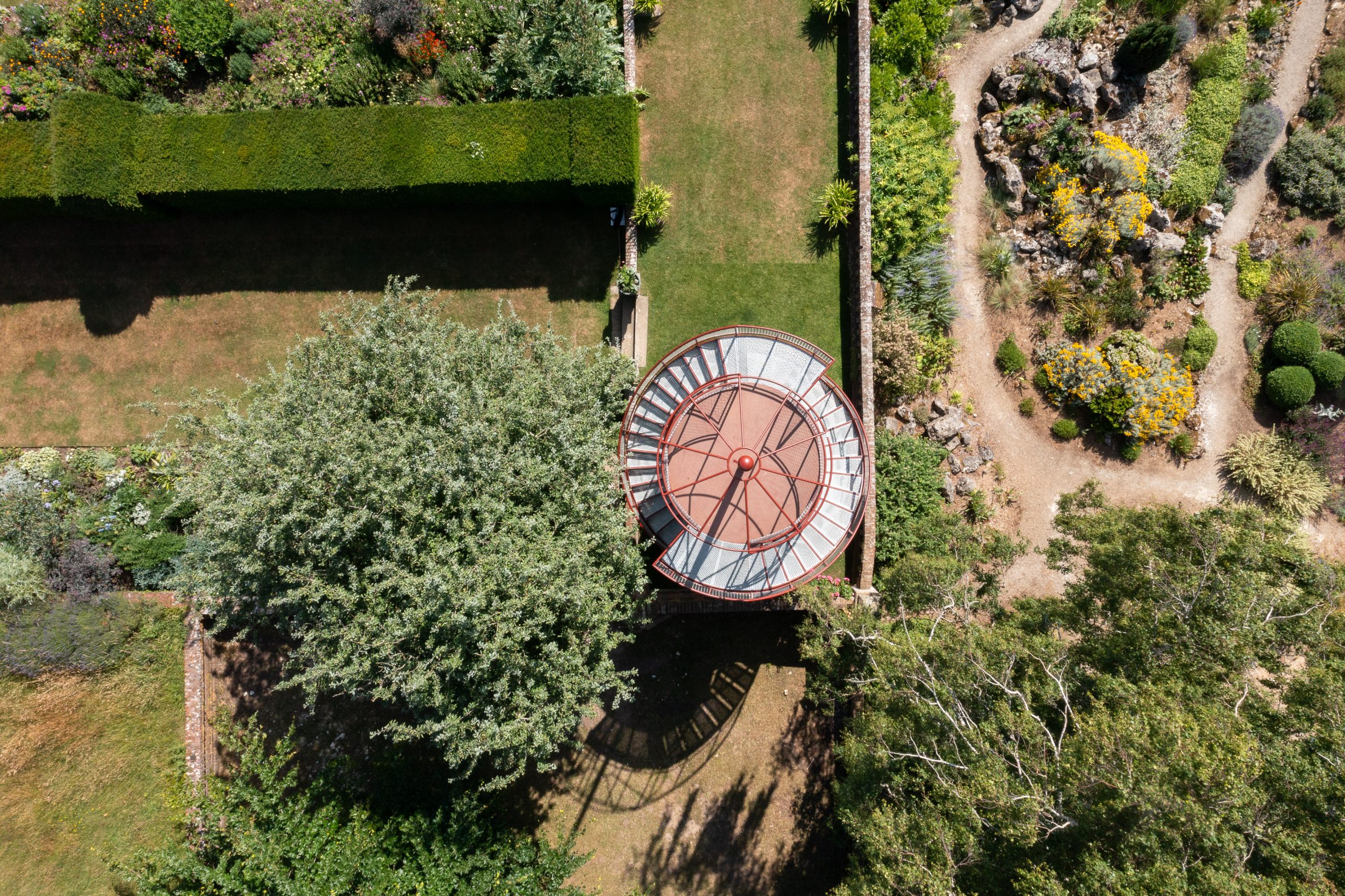 The Tower creates a glazed First Floor summerhouse & a Second Floor public viewing platform enjoying great elevated vistas over the Sunken Garden, the Rock Garden & the valley beyond. The swirling double staircase makes a virtue of the Building Regulation requirement to have separate public upwards & downwards access.