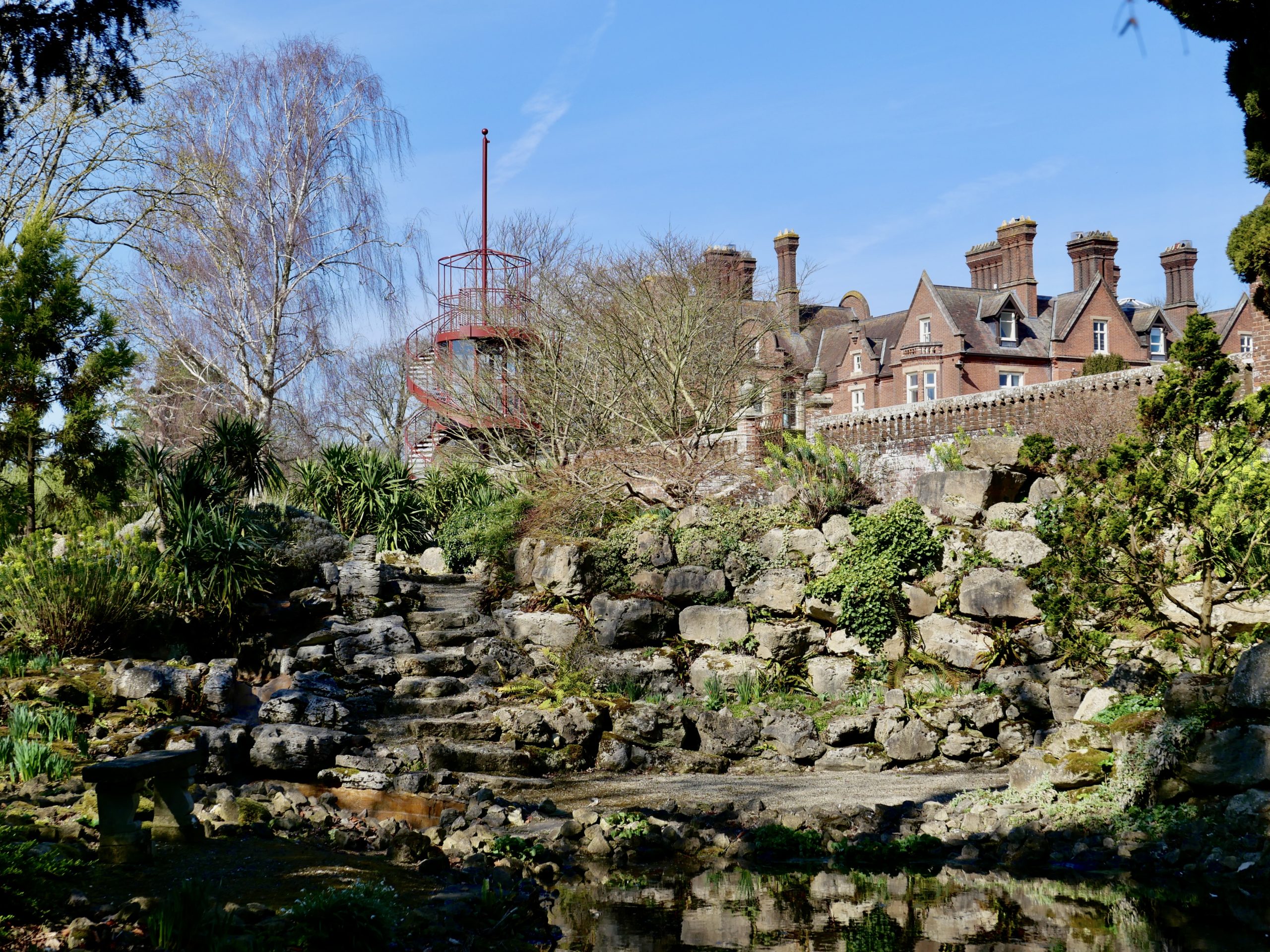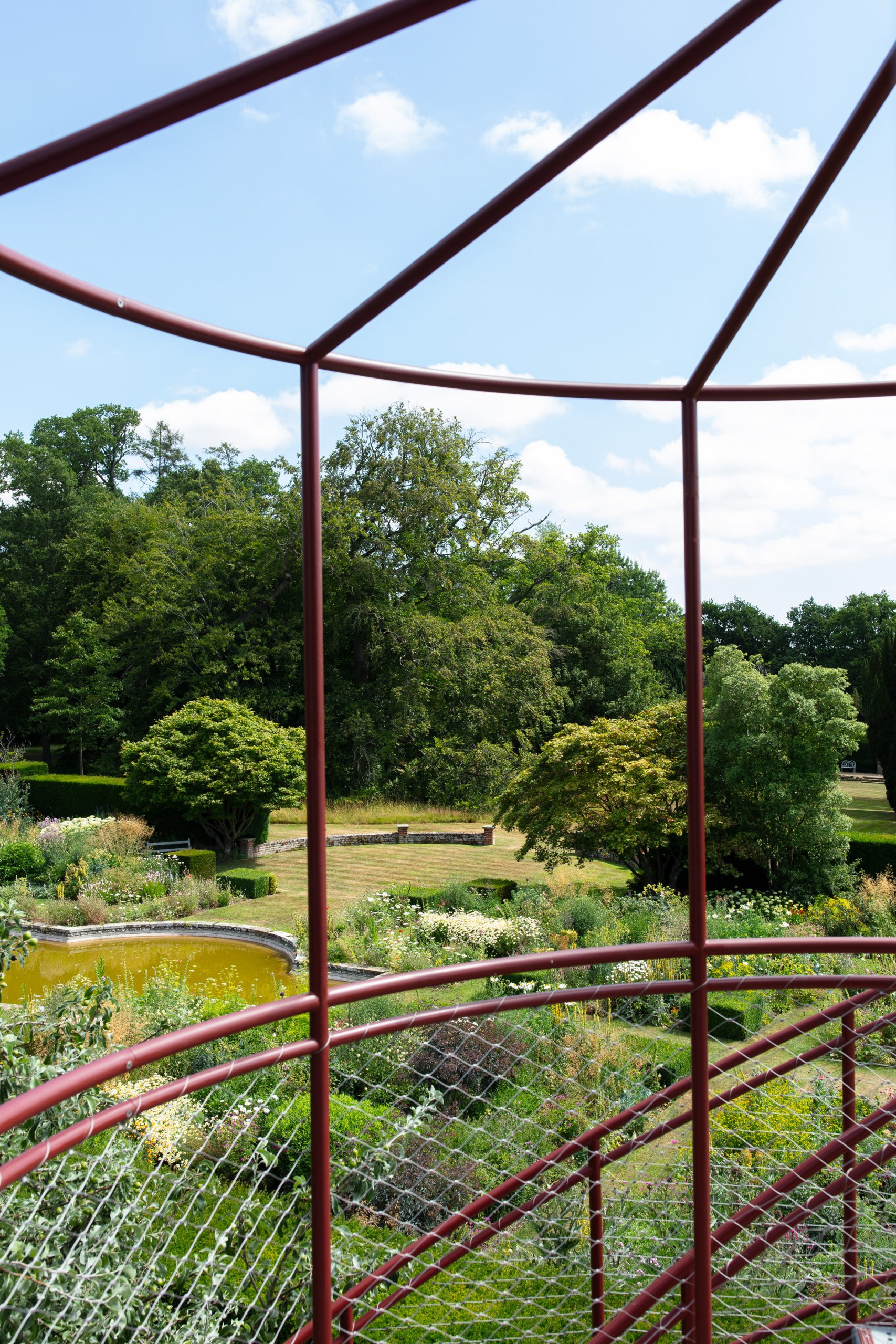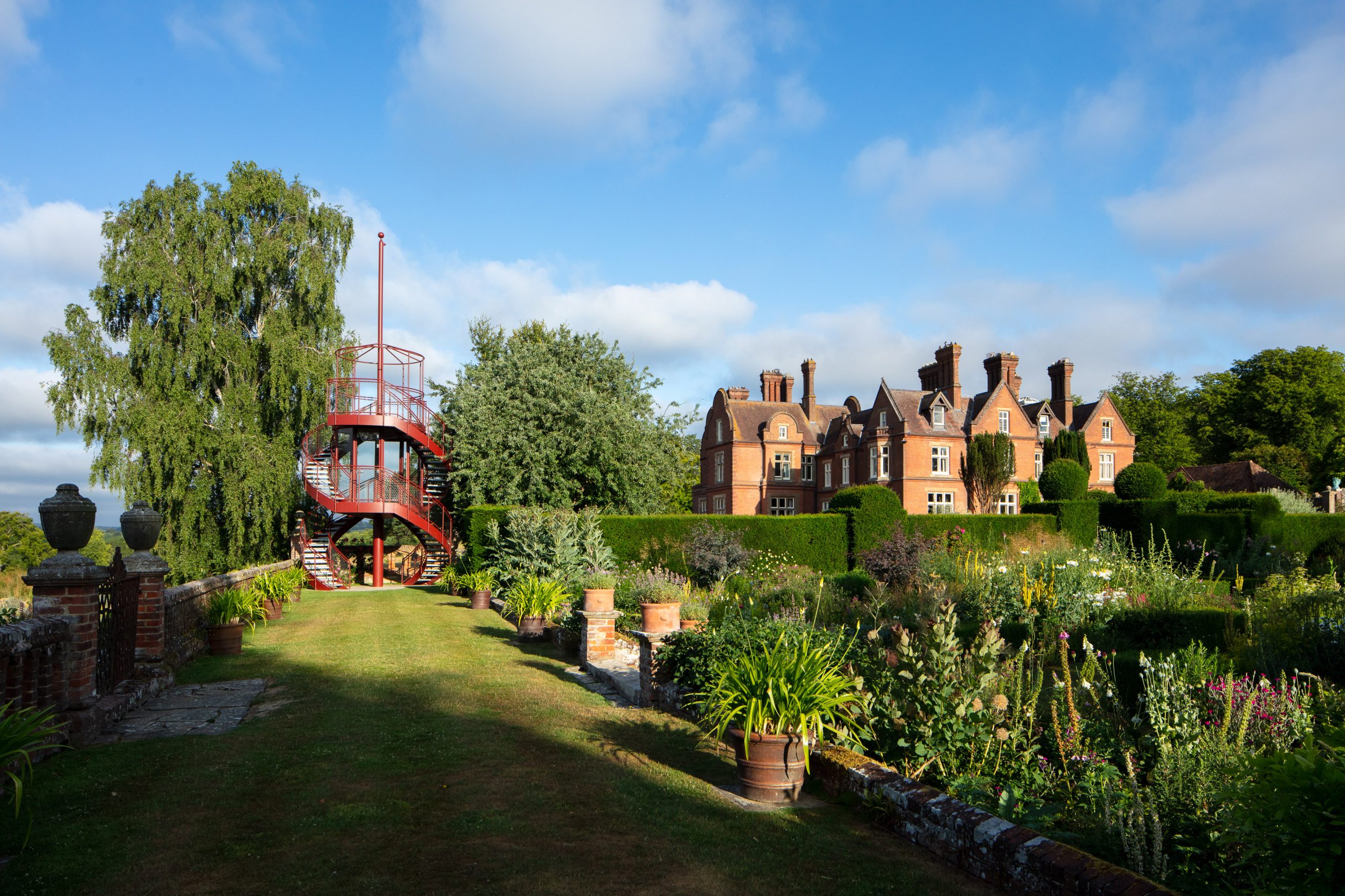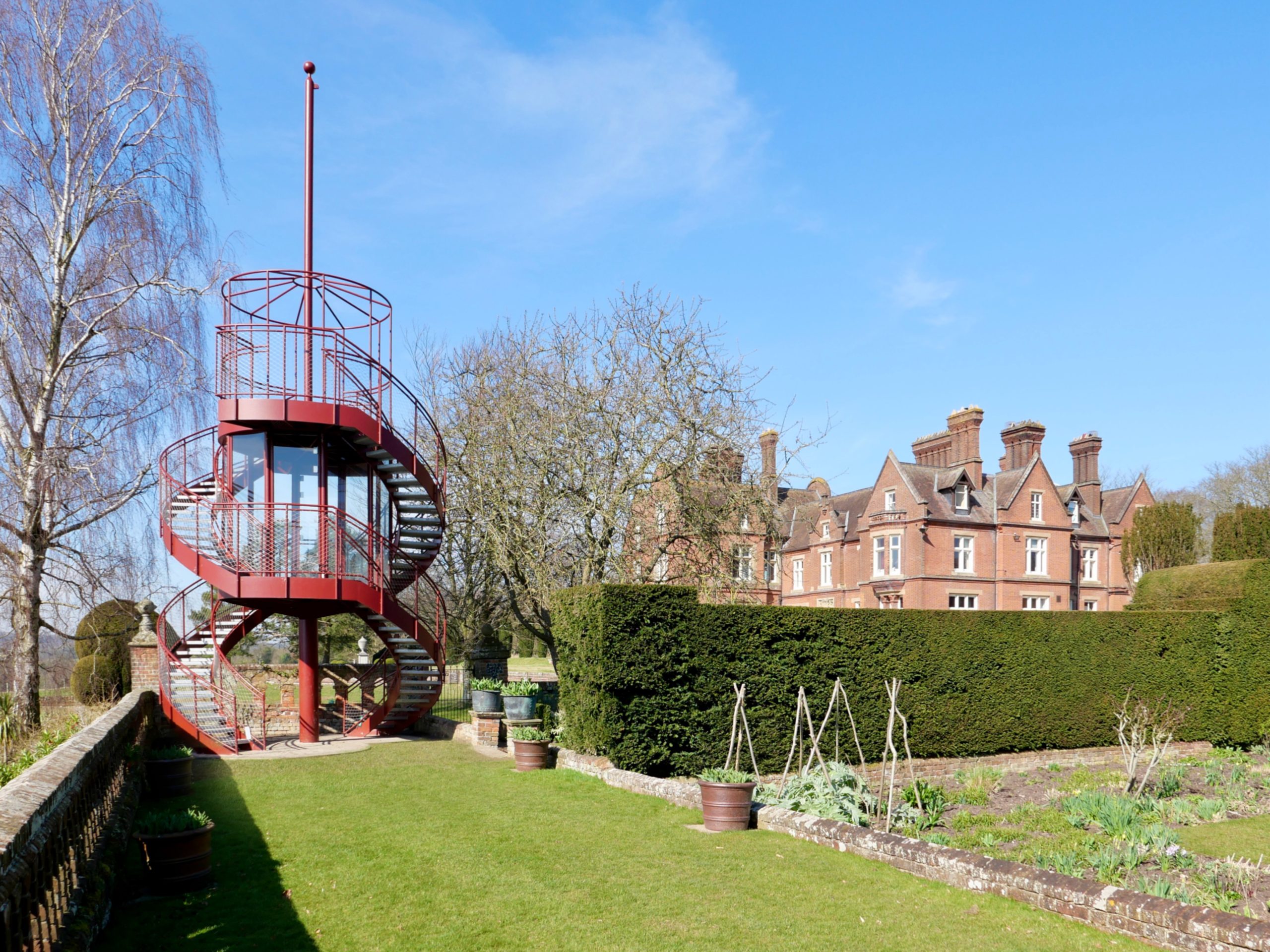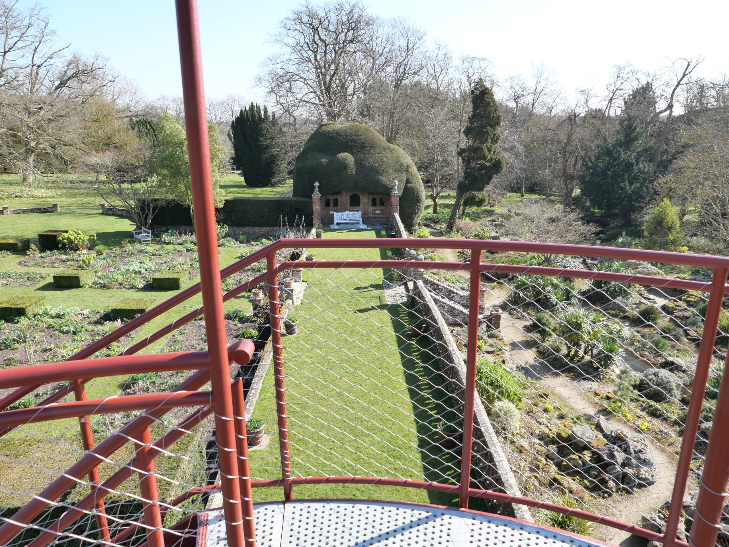 The Tower creates a glazed First Floor summerhouse & a Second Floor public viewing platform enjoying great elevated vistas over the Sunken Garden, the Rock Garden & the valley beyond. The swirling double staircase makes a virtue of the Building Regulation requirement to have separate public upwards & downwards access.